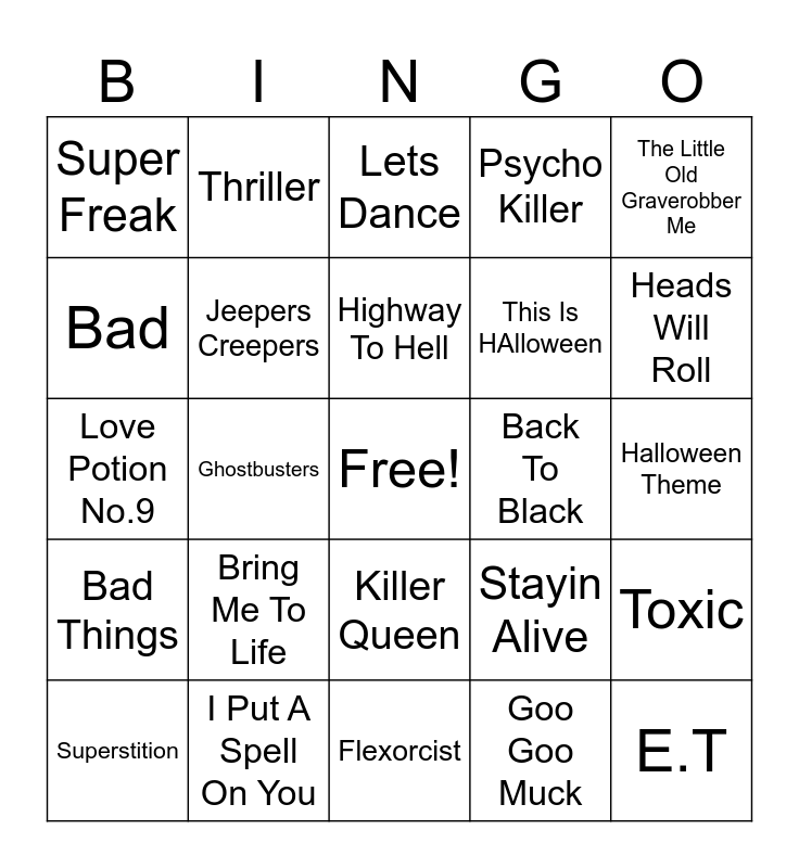 This bingo card has a free space and 72 words: Banana Boat, Thriller, Ghostbusters, Monster Mash, Somebody's Watching Me, Time War, Psycho Killer, Tainted Love, This Is HAlloween, The Addams Family, Superstition, The Purple People Eater, Heads Will Roll, Super Freak, Disturbia, Love Potion No.9, Stayin Alive, The Little Old Graverobber Me, Come With Me Now, Halloween Theme, Bring Me To Life, E.T, Toxic, Wanted Dead Or Alive, Sweet Dreams, Spooky, Scary Skeletons, Jump in The Line, Bad Reputation, (Don’t Fear) The Reaper, Maneater, I Put A Spell On You, Bad Moon Rising, Crazy Train, Feed My Frankenstein, Goo Goo Muck, Toccata And Fugue in D Minor, Batman, Wolfman , Frankenstein or Dracula, Man With A Hex, Bad, Bad guy, Killer Queen, Master of Puppets, Mr.Sandman, Cleanin’ up The Town, Jekyll and Hyde, Bad Things, Sunshine, Lollipops and Rainbows, Zombie Zoo, Witchcraft, Haunted House, Cherry Bomb, Get Ur Freak on, Marry The Night, Back To Black, Puttin’ On the Ritz, Spiderhead, Lets Dance, Highway To Hell, Sweet But Psycho, Ghost, Magic Man, Gremlins, Vampire, Flexorcist, Pet Sematary, The Kids Aren’t Alright, Jeepers Creepers, Frankenstein Rock, Jaws, Blinding Lights, Tip Toe Thru' the tulips with Me and My Girlfriend Is A Witch.