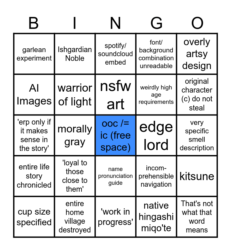 This bingo card has a free space and 34 words: voidsent, native hingashi miqo'te, D&D alignment, character not from ff setting, entire life story chronicled, warrior of light, overly artsy design, cup size specified, Ishgardian Noble, half-___, nsfw art, spotify/ soundcloud embed, f-list, random stat sheet, edge lord, original character (c) do not steal, entire home village destroyed, 'erp only if it makes sense in the story', 'loyal to those close to them', incom-prehensible navigation, name pronunciation guide, extremely deep quote, garlean experiment, very specific smell description, 'work in progress', That's not what that word means, font/ background combination unreadable, Slideshow, weirdly high age requirements, AI Images, 'muscles hidden under fat', morally gray, kitsune and template carrd.