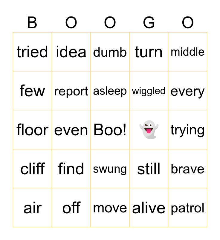 This bingo card has a free space and 24 words: find, off, asleep, air, middle, tried, few, idea, 👻, swung, wiggled, floor, still, brave, report, alive, trying, dumb, every, even, patrol, cliff, turn and move.