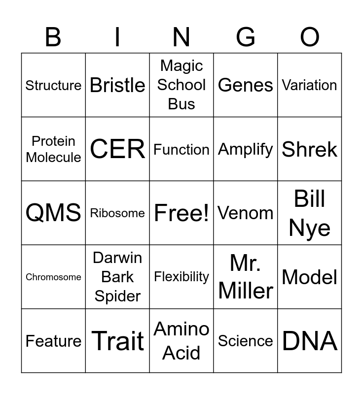 This bingo card has a free space and 24 words: Darwin Bark Spider, Trait, Function, Feature, Variation, Structure, Protein Molecule, Bristle, Venom, Flexibility, Amplify, QMS, Mr. Miller, Model, CER, Science, Bill Nye, Magic School Bus, Shrek, Ribosome, DNA, Chromosome, Genes and Amino Acid.