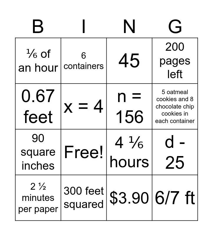 This bingo card has 18 words: Free!, 6/7 ft, 45, ⅙ of an hour, 4 ⅙ hours, 200 pages left, 2 ½ minutes per paper, 6 containers, 5 oatmeal cookies and 8 chocolate chip cookies in each container, 90 square inches, $3.90, 0.67 feet, d - 25, x = 4, n = 156, 12 meters, 300 feet squared and -45.
