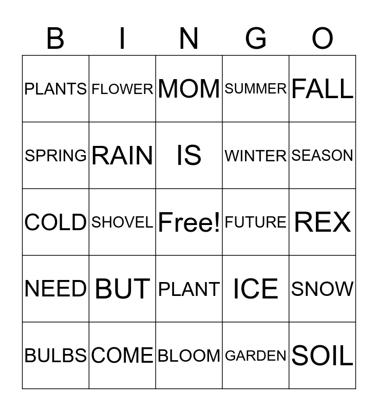 This bingo card has a free space and 24 words: BUT, COME, IS, BULBS, FALL, PLANTS, SPRING, FLOWER, FUTURE, PLANT, WINTER, COLD, ICE, SNOW, RAIN, GARDEN, REX, MOM, SEASON, SHOVEL, SOIL, NEED, SUMMER and BLOOM.