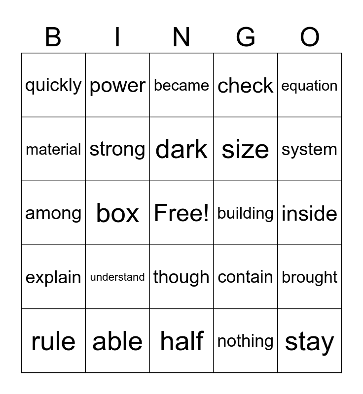 This bingo card has a free space and 31 words: half, gave, box, wait, quickly, became, strong, contain, building, nothing, inside, stay, known, stood, system, behind, brought, understand, explain, though, equation, object, rule, power, size, material, check, among, able, dark and special.