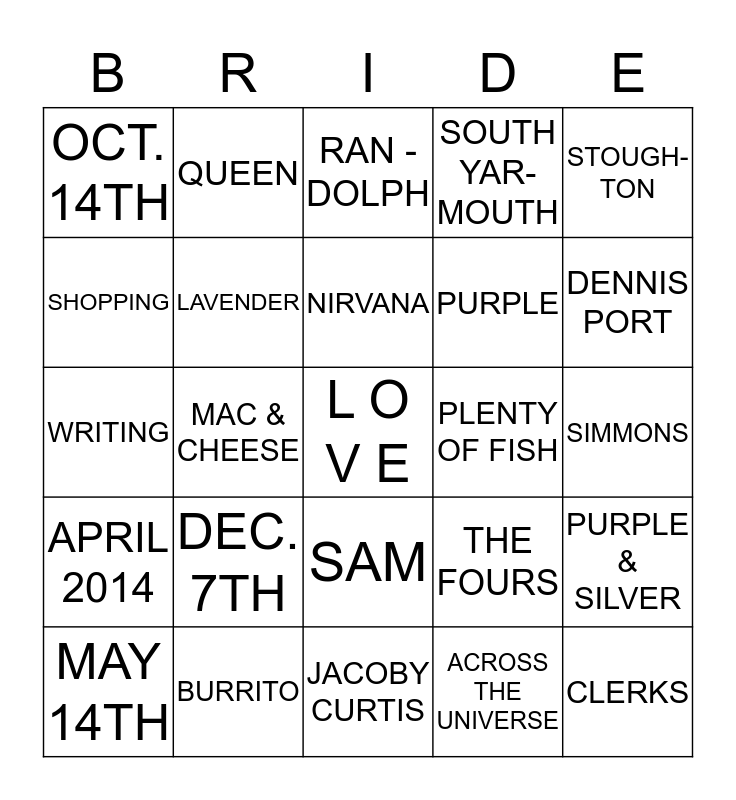 This bingo card has a free space and 24 words: DEC. 7TH, BURRITO, NIRVANA, MAY 14TH, STOUGH- TON, OCT. 14TH, SHOPPING, QUEEN, PLENTY OF FISH, SAM, PURPLE, WRITING, THE FOURS, PURPLE & SILVER, LAVENDER, ACROSS THE UNIVERSE, SIMMONS, RAN - DOLPH, DENNIS PORT, MAC & CHEESE, CLERKS, APRIL 2014, SOUTH YAR- MOUTH and JACOBY CURTIS.