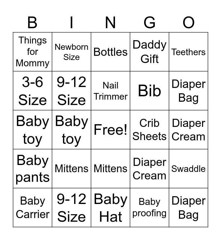 ⚠ This card has duplicate items: Playmat (2), Diaper Bag (2), Baby Carrier (2), Baby Hat (2), Mittens (2), Baby pants (2), Newborn Size (2), 0-3 Size (2), 3-6 Size (2), 6-9 Size (2), 9-12 Size (2), Daddy Gift (2), Swaddle (2), Diaper Cream (2), Pacifier (2), Blanket (2), Nail Trimmer (2), Crib Sheets (2), Bottles (2), Teethers (2), Baby toy (2), Baby proofing (2), Things for Mommy (2), Bib (2)