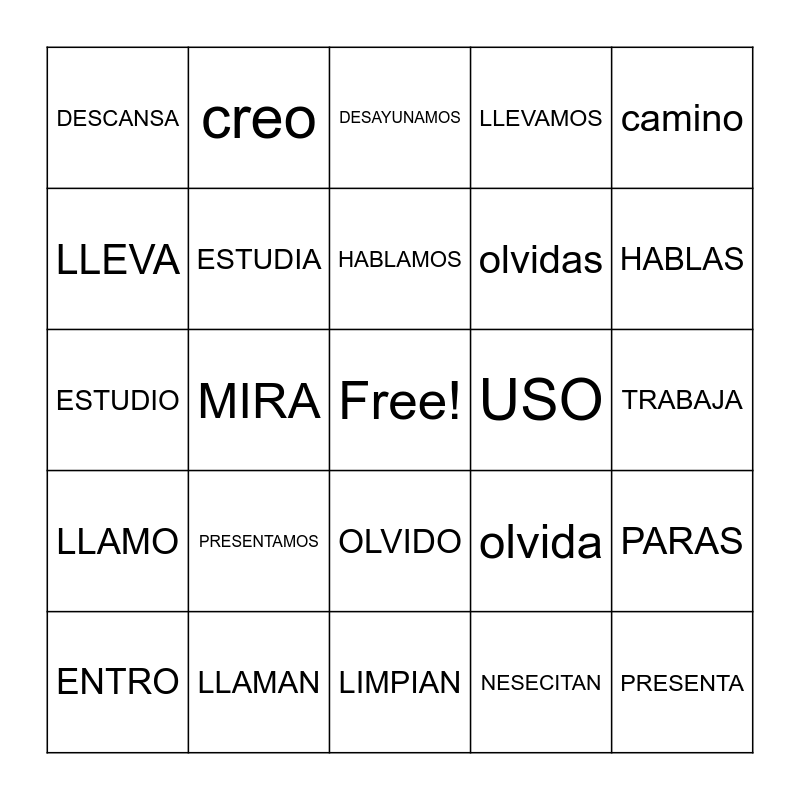 This bingo card has a free space and 114 words: LLAMAMOS, HABLAN, MIRO, ESCUCHAS, COMPRA, NESECITO, LLEVAMOS, USAN, PREPARAS, PARO, TOMAMOS, ESTUDIAN, TRABAJAS, PRESENTO, DESCANSAS, CREAMOS, OLVIDO, MANEJAMOS, CAMINAS, VAIJA, ENTRO, DESAYUNAMOS, CENAN, LIMPIO, LLAMA, LLAMO, LLAMAN, LLAMAS, HABLA, HABLO, HABLAS, HABLAMOS, MIRA, MIRAS, MIRAMOS, ESCUCHO, ESCUCHA, ESCUCHAMOS, ESCUCHAN, COMPRAS, COMPRO, COMPRAMOS, COMPRAN, NESECITA, NESECITAS, NESECITAMOS, NESECITAN, LLEVA, LLEVAS, LLEVO, LLEVAN, USO, USA, USAMOS, USAS, PREPARA, PREPARO, PREPAMOS, PREPAN, PARA, PARAS, PARAMOS, PARAN, TOMA, TOMAS, TOMO, TOMAN, ESTUDIA, ESTUDIO, ESTUDIAMOS, TRABAJA, TRABAJO, TRABAJAN, PRESENTA, PRESENTAS, PRESENTA, PRESENTAMOS, DESCANSA, DESCANSO, DESCANSAN, DESCANSAMOS, creo, crea, olvida, olvidas, olvidamos, olvidan, maneja, manejan, manejas, manejo, camina, caminamos, camino, vaijo, vaijas, vaijamos, viajan, entra, entras, entramos, entran, DESAYUNAN, CENA, CENO, LIMPIA, LIMPIAS, LIMPIAN, COCINAS, COCINA, COCINAMOS, COCINO, COCINAN and CENAS.