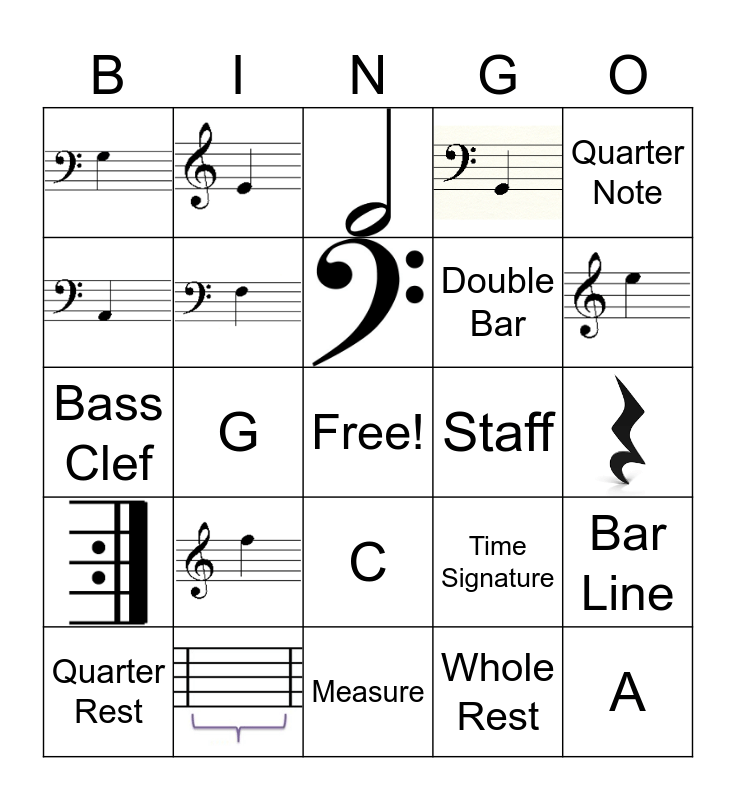This bingo card has 31 images, a free space and 21 words: A, Measure, E, Treble Clef, B, Repeat Sign, Bar Line, Time Signature, Staff, Quarter Note, G, Whole Rest, Double Bar, C, D, F, Bass Clef, Half Note, Whole Note, Quarter Rest and Half Rest.