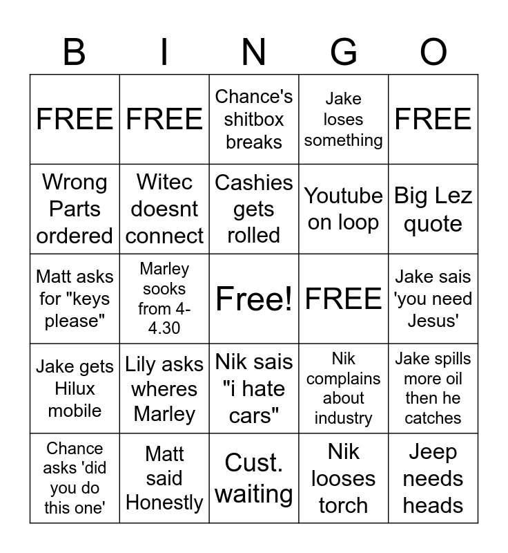 This bingo card has a free space and 24 words: Lily asks wheres Marley, Matt said Honestly, Cashies gets rolled, Chance asks 'did you do this one', FREE, FREE, Wrong Parts ordered, FREE, FREE, Nik sais "i hate cars", Youtube on loop, Matt asks for "keys please", Nik complains about industry, Jake spills more oil then he catches, Witec doesnt connect, Nik looses torch, Jake sais 'you need Jesus', Chance's shitbox breaks, Big Lez quote, Marley sooks from 4-4.30, Jeep needs heads, Jake gets Hilux mobile, Jake loses something and Cust. waiting.