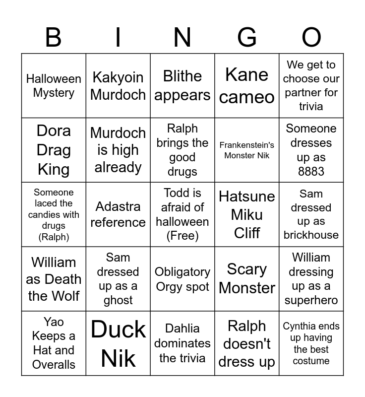 This bingo card has a free space and 24 words: Sam dressed up as a ghost, Duck Nik, Ralph brings the good drugs, Yao Keeps a Hat and Overalls, We get to choose our partner for trivia, Halloween Mystery, Dora Drag King, Kakyoin Murdoch, Hatsune Miku Cliff, Obligatory Orgy spot, Frankenstein's Monster Nik, Someone laced the candies with drugs (Ralph), Scary Monster, William dressing up as a superhero, Murdoch is high already, Ralph doesn't dress up, Sam dressed up as brickhouse, Blithe appears, Someone dresses up as 8883, Adastra reference, Cynthia ends up having the best costume, William as Death the Wolf, Kane cameo and Dahlia dominates the trivia.