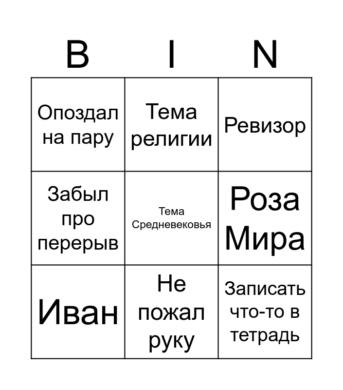 This bingo card has a free space and 8 words: Роза Мира, Ревизор, Тема религии, Иван, Опоздал на пару, Записать что-то в тетрадь, Забыл про перерыв and Не пожал руку.
