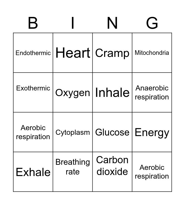 This bingo card has 19 words: Glucose, Lactic acid, Cramp, Aerobic respiration, Energy, Exothermic, Carbon dioxide, Endothermic, Heart, Aerobic respiration, Cytoplasm, Oxygen, Inhale, Breathing rate, Exhale, Mitochondria, Mitochondria, Anaerobic respiration and Lactic acid.