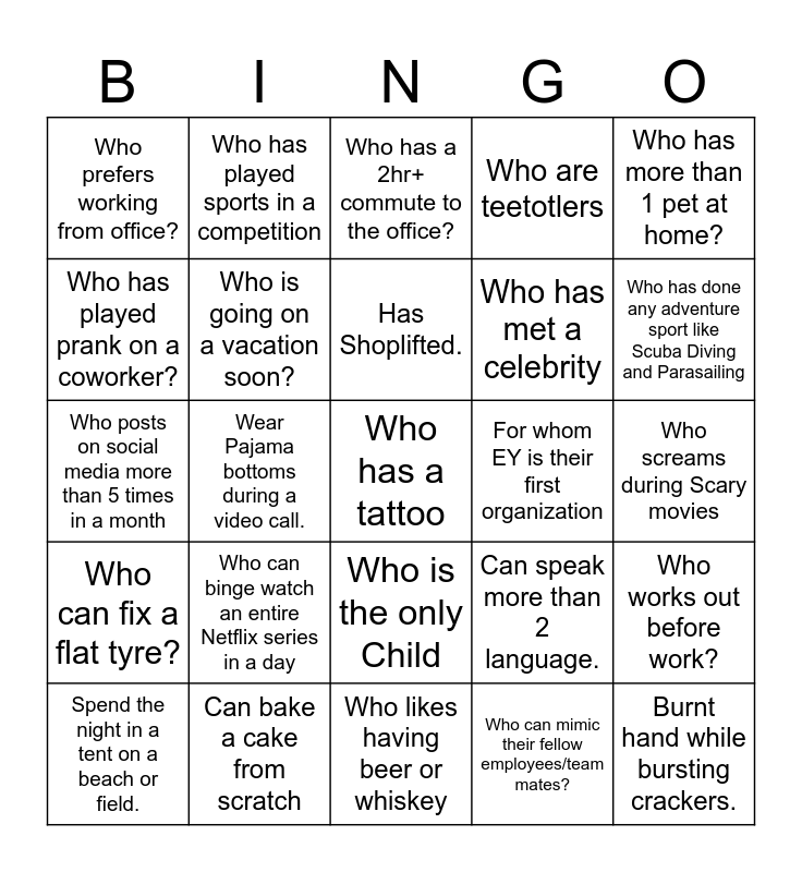 This bingo card has 25 words: Who can fix a flat tyre?, Can bake a cake from scratch, Who has a tattoo, Who can mimic their fellow employees/team mates?, Who has more than 1 pet at home?, Who prefers working from office?, Who has played sports in a competition, Who has a 2hr+ commute to the office?, For whom EY is their first organization, Who works out before work?, Who has played prank on a coworker?, Who is going on a vacation soon?, Who likes having beer or whiskey, Can speak more than 2 language., Who has done any adventure sport like Scuba Diving and Parasailing, Spend the night in a tent on a beach or field., Wear Pajama bottoms during a video call., Has Shoplifted., Who has met a celebrity, Who screams during Scary movies, Who posts on social media more than 5 times in a month, Who can binge watch an entire Netflix series in a day, Who is the only Child, Who are teetotlers and Burnt hand while bursting crackers..