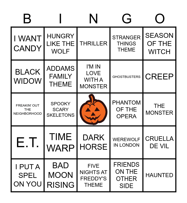 This bingo card has a free space and 32 words: FRIENDS ON THE OTHER SIDE, SUPERSTITION, SPOOKY SCARY SKELETONS, THIS IS HALLOWEEN, E.T., ADDAMS FAMILY THEME, SEASON OF THE WITCH, CRUELLA DE VIL, HUNGRY LIKE THE WOLF, SOMEBODY'S WATCHING ME, I'M IN LOVE WITH A MONSTER, THRILLER, SUPER FREAK, BLACK MAGIC, PHANTOM OF THE OPERA, MONSTER MASH, I PUT A SPEL ON YOU, FREAKIN' OUT THE NEIGHBORHOOD, DARK HORSE, TIME WARP, WEREWOLF IN LONDON, VAMPIRE, THE MONSTER, BAD MOON RISING, HAUNTED, STRANGER THINGS THEME, GHOSTBUSTERS, BLACK WIDOW, I WANT CANDY, FIVE NIGHTS AT FREDDY'S THEME, ZOMBIE and CREEP.
