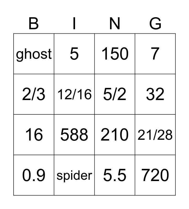 This bingo card has 18 words: 588, 720, 150, ghost, 210, 7, 0.9, 5, 32, 16, 5.5, 2/3, 21/28, 12/16, 5/2, 12/15, spider and Brains.