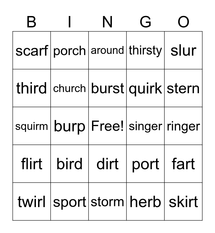 This bingo card has a free space and 39 words: shirt, birthday, party, port, fart, flirt, burp, flower, singer, ringer, third, porch, blur, stern, squirm, bird, dirt, thirsty, whirl, twirl, church, burst, herb, slur, spar, sport, storm, snarl, short, scarf, clerk, hurt, quirk, skirt, firm, many, around, her and girl.
