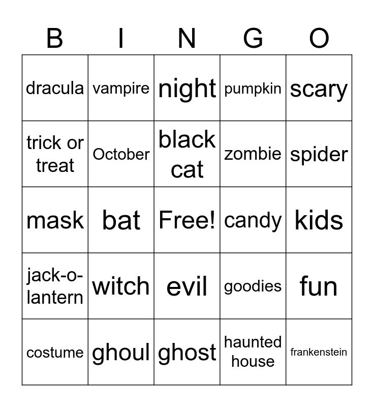 This bingo card has a free space and 25 words: witch, ghost, black cat, costume, scary, dracula, trick or treat, vampire, candy, evil, zombie, mask, goodies, fun, October, dark, kids, night, spider, bat, frankenstein, ghoul, jack-o-lantern, pumpkin and haunted house.