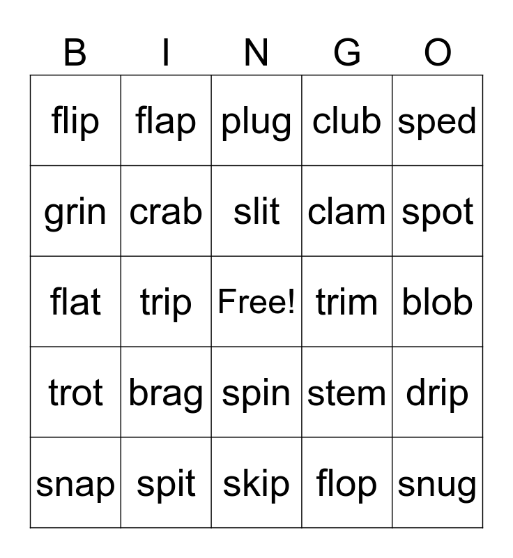 This bingo card has a free space and 25 words: brag, skip, slit, snap, sped, flip, grin, flap, trim, spin, clam, flat, stem, drip, crab, slot, blob, plug, spot, trip, snug, spit, trot, club and flop.
