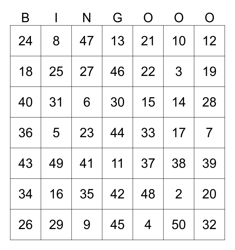 This bingo card has 49 words: 2, 3, 4, 5, 6, 7, 8, 9, 10, 11, 12, 13, 14, 15, 16, 17, 18, 19, 20, 21, 22, 23, 24, 25, 26, 27, 28, 29, 30, 31, 32, 33, 34, 35, 36, 37, 38, 39, 40, 41, 42, 43, 44, 45, 46, 47, 48, 49 and 50.