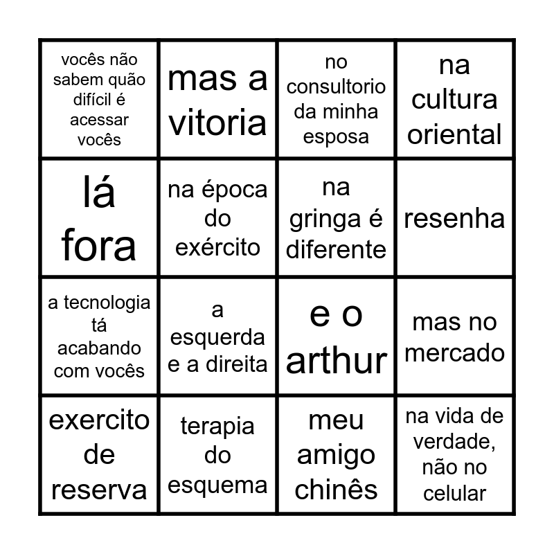 This bingo card has 16 words: exercito de reserva, terapia do esquema, no consultorio da minha esposa, na cultura oriental, lá fora, mas a vitoria, e o arthur, mas no mercado, vocês não sabem quão difícil é acessar vocês, na época do exército, meu amigo chinês, resenha, a tecnologia tá acabando com vocês, a esquerda e a direita, na gringa é diferente and na vida de verdade, não no celular.