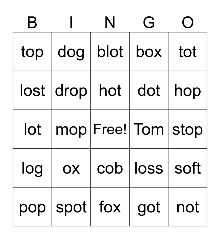 This bingo card has a free space and 24 words: ox, spot, hot, pop, tot, top, lost, dog, Tom, cob, dot, lot, loss, soft, drop, got, stop, blot, hop, mop, not, log, box and fox.