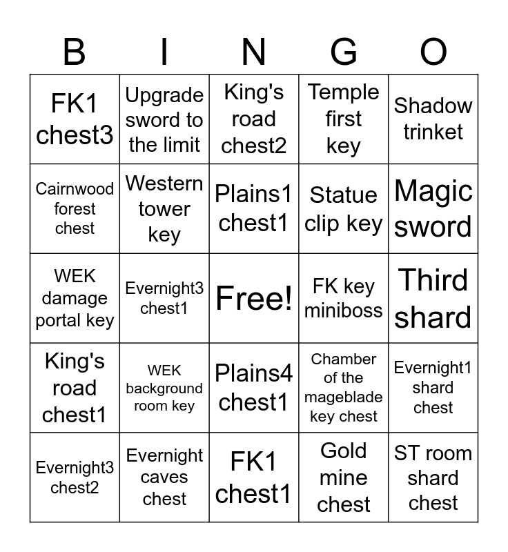 This bingo card has a free space and 96 words: The gardener, The destroyer, Szan, FK key miniboss, Root, Boulder, Zak, Jack, Edogani, Bishop, Slick, Needle, Thorn, Magic sword, Dusty hut chest, Cairnwood forest chest, Plains1 chest1, Murky small cave chest, Plains1 chest2, Ferryman quest, Plains2 chest1, Plains2 chest2, Marblemist cave chest, Plains3 chest1, Plains4 chest1, FK1 chest1, FK1 chest2, FK1 chest3, FK2 chest1, Dimension rift, Dragon's grasp, Chamber of the mageblade key chest, Chamber of the mageblade shard chest, Fire trinket, Shadow trinket, Ice trinket, Evernight1 shard chest, Evernight2 chest1, Dog grave room, Evernight3 chest1, Evernight3 chest1, Evernight3 chest2, ST room shard chest, Evernight caves chest, King's road chest1, King's road chest2, Walls of florennum chest, Sewers chest, Western tower key chest, Outskirts chest, Huge cave chest, Thieves' hideout chest, Wastelands1 chest1, Wastelands2 chest1, Wastelands house chest, Greyhedge crossing chest (down), Greyhedge crossing chest (up), Great caves1 chest1, Great caves up path chest, Purplemoor1 chest, Blob arena chest, Left to blob arena chest, Left to purplemoor chest, Dephts1 chest1, Dephts3 chest1, Dephts4 chest1, Greyhedge caves chest, Slopes yellow shard, Infested cave chest, Gold mine chest, Slopes2 chest1, Slopes2 chest2, Temple chest1, Temple chest2, WEK chest1, WEK chest2, Walls of florennum key, Western tower key, Overseer key, Statue clip key, Temple first key, Temple bat climb key, Temple corruptor key, WEK1 corruptor key, WEK1 drift key, WEK damage portal key, WEK background room key, First shard, Second shard, Third shard, Fourth shard, Golden boulder quest, Die to a crusher in WEK, Upgrade magic to the limit, Upgrade sword to the limit and Upgrade health to the limit.