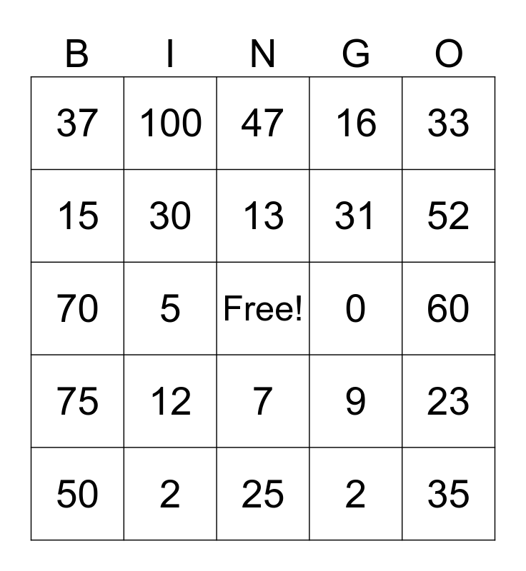 This bingo card has a free space and 39 words: 1, 10, 19, 30, 50, 7, 13, 21, 33, 75, 5, 16, 35, 60, 0, 12, 22, 37, 99, 9, 15, 25, 31, 52, 11, 66, 77, 88, 55, 100, 3, 8, 47, 2, 2, 20, 23, 70 and 98.