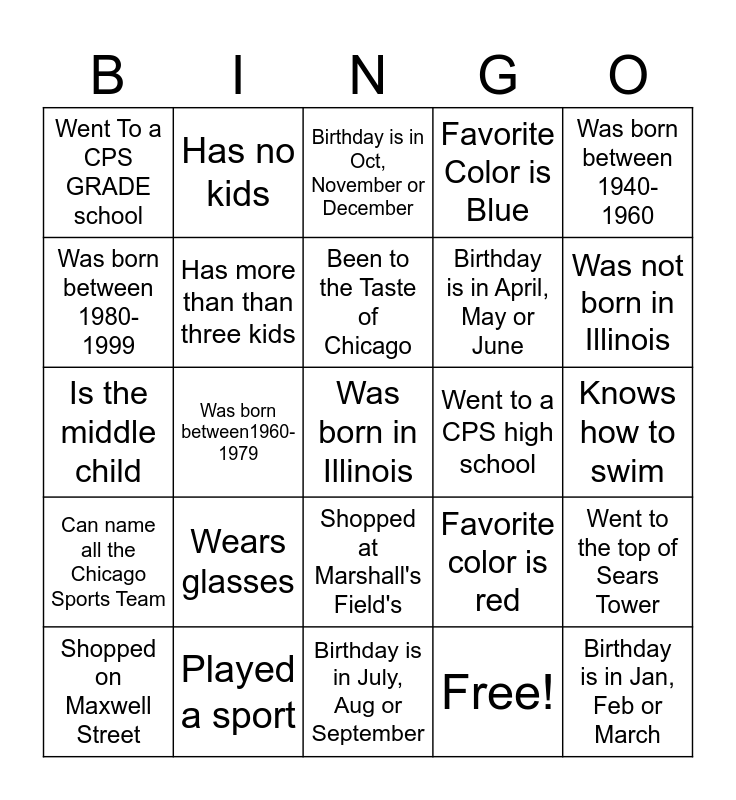This bingo card has 30 words: Played a sport, Is the Oldest Child, Was born between1960-1979, Is the last child, Went To a CPS GRADE school, Birthday is in Oct, November or December, Has more than than three kids, Shopped at Marshall's Field's, Went to a CPS high school, Birthday is in July, Aug or September, Knows how to swim, Was born in Illinois, Free!, Birthday is in Jan, Feb or March, Was not born in Illinois, Has a pet, Favorite color is red, Can name all the Chicago Sports Team, Wears glasses, Was born between 1940-1960, Is the middle child, Starts their day with coffee, Has no kids, Birthday is in April, May or June, Was born between 1980-1999, Favorite Color is Blue, Went to the top of Sears Tower, Shopped on Maxwell Street, Been to the Taste of Chicago and Remember a Chicago Blizzard.