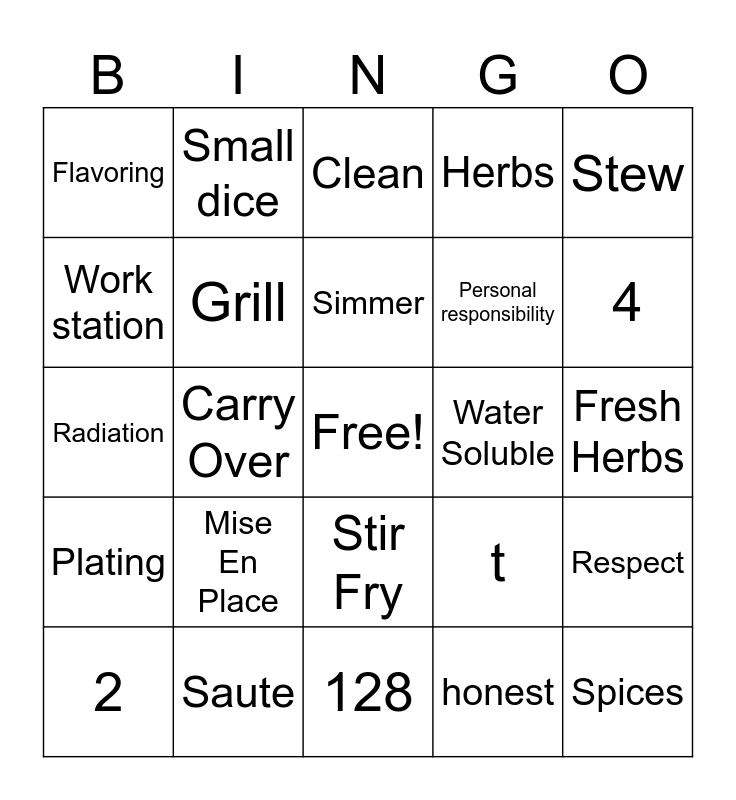 This bingo card has a free space and 40 words: Convection, Radiation, Broil, Grill, Saute, Stir Fry, Simmer, Steam, Stew, Plating, Carry Over, Herbs, Spices, Fresh Herbs, Water Soluble, Mise En Place, Seasoning, Flavoring, Sanitizer, Clean, Respect, honest, Personal responsibility, Work station, Garde-Manger, Standardized recipe, Recipe cost, 8, 16, 32, 212, 2, T, t, 4, 128, yield, Cross contamination, Small dice and Batonnet.