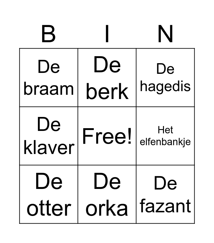This bingo card has a free space and 8 words: Het elfenbankje, De hagedis, De berk, De otter, De braam, De fazant, De klaver and De orka.