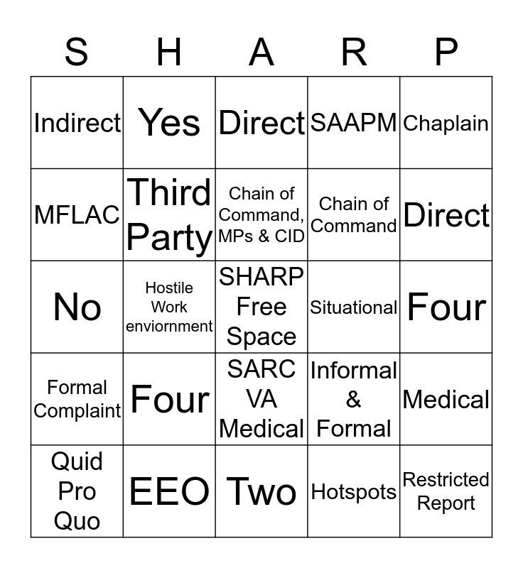 This bingo card has a free space and 24 words: Four, EEO, Chain of Command, MPs & CID, Quid Pro Quo, Chaplain, Indirect, MFLAC, Yes, Situational, SARC VA Medical, Chain of Command, No, Informal & Formal, Medical, Third Party, Hotspots, Four, Direct, Direct, Hostile Work enviornment, Restricted Report, Formal Complaint, SAAPM and Two.