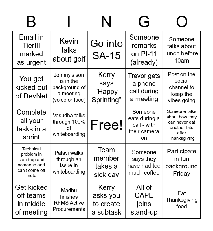 This bingo card has a free space and 34 words: Someone on your team gets kicked out of DevNet, Peter's cat comes on camera, Kerry's cat comes on camera, IV&V has background noise in call, Someone talks about how they can never eat another bite after Thanksgiving, You get kicked out of DevNet, Johnny's son is in the background of a meeting (voice or face), Kerry asks you to create a subtask, Trevor gets a phone call during a meeting, Eat Thanksgiving food, Complete all your tasks in a sprint, Kevin talks about golf, All of CAPE joins stand-up, Attend a happy hour!, Technical problem in stand-up and someone and can't come off mute, Vasudha talks through 100% of whiteboarding, Team member takes a sick day, Someone eats during a call - with their camera on, Participate in fun background Friday, Get kicked off teams in middle of meeting, Madhu finishes RFMS Active Procurements, All of the team has their camera on, Someone remarks on PI-11 (already), Post on the social channel to keep the vibes going, TierIII gets cancelled, Palavi walks through an issue in whiteboarding, Go into SA-15, Someone is using a blanket in office, Someone talks about lunch before 10am, Email in TierIII marked as urgent, Fire drill at SA-15, Kerry says "Happy Sprinting", Someone says they have had too much coffee and Attend a campus recruiting event.