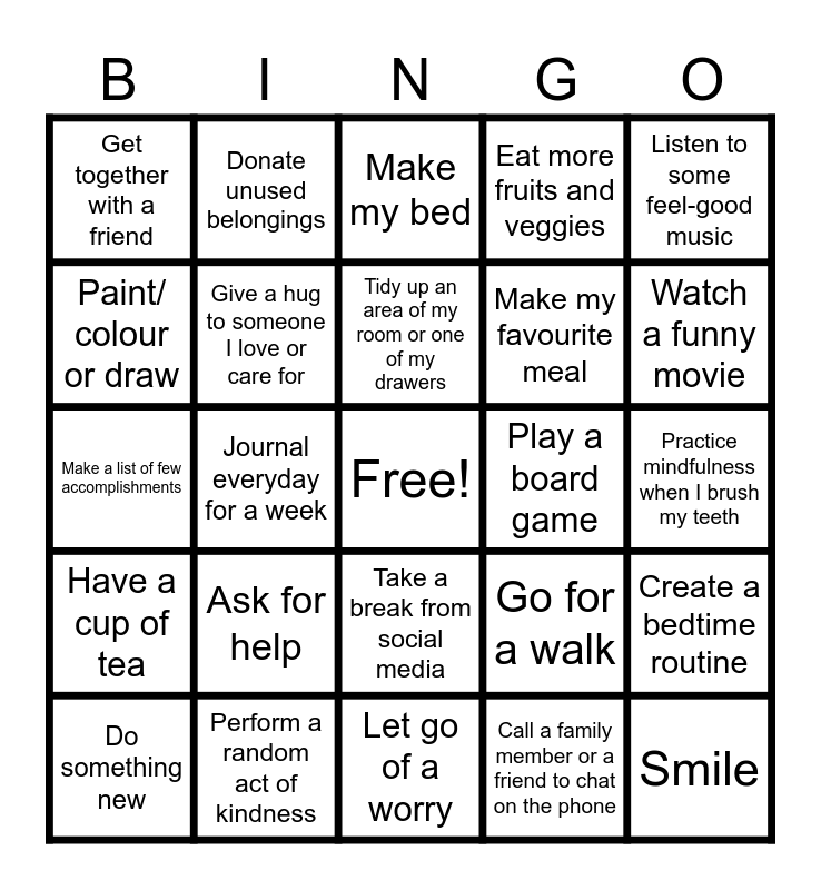 This bingo card has a free space and 48 words: Accept my feelings, Ask for help, Attend a Healthy Start group, Call a family member or a friend to chat on the phone, Create a bedtime routine, Do something new, Donate unused belongings, Drink more water, Eat more fruits and veggies, Forgive myself, Get together with a friend, Give a hug to someone I love or care for, Give myself time to rest, Go for a walk, Go to bed 30 minutes early, Have a cup of tea, Journal everyday for a week, Let go of a worry, Listen to a TED Talk or Podcast, Listen to some feel-good music, Make a list of few accomplishments, Make a project or craft, Make my bed, Make my favourite meal, Move my body (workout, dance, stretch, walk), Paint/ colour or draw, Perform a random act of kindness, Plan my day or my week, Play a board game, Practice mindfulness when I brush my teeth, Read or listen to a book, Say something nice to myself, See a positive side of a situation, Sit outside, look at the stars and make a wish, Smile, Spend time in nature, Take 10 deep breaths, Take a break from social media, Take a nap, Take a nice shower or bath, Think about something nice, meditate or pray, Think of a favourite memory, Tidy up an area of my room or one of my drawers, Try a new recipe, Watch a funny movie, Watch the sunset or sunrise, Write one or two things I am grateful for and Write things I like about myself.