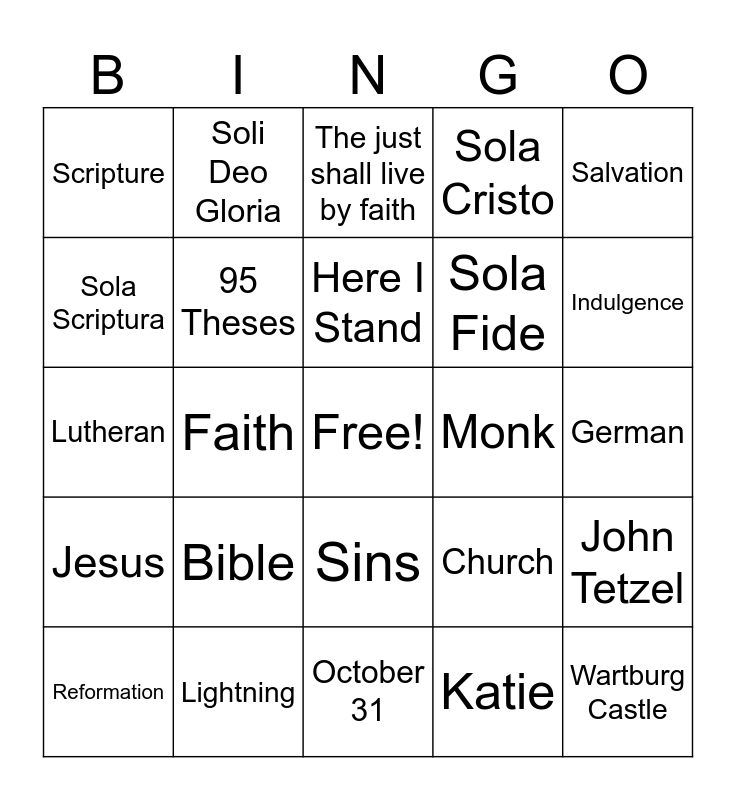 This bingo card has a free space and 29 words: Reformation, Martin Luther, Faith, Grace, Scripture, The just shall live by faith, 95 Theses, Bible, Monk, Lightning, German, Wartburg Castle, October 31, Katie, Indulgence, Forgiveness, Sins, Jesus, Salvation, Lutheran, Church, Sola Gratia, Sola Fide, Sola Scriptura, Sola Cristo, Soli Deo Gloria, John Tetzel, Here I Stand and Catechism.