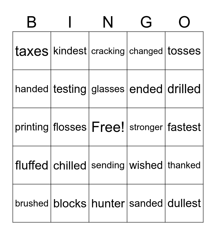 This bingo card has a free space and 30 words: blocks, tricks, flosses, mashes, taxes, cracking, testing, sending, stronger, hunter, fastest, dullest, sanded, blended, drilled, pressed, wished, fluffed, chilled, tosses, printing, stinger, kindest, ended, handed, changed, thanked, brushed, glasses and quilted.