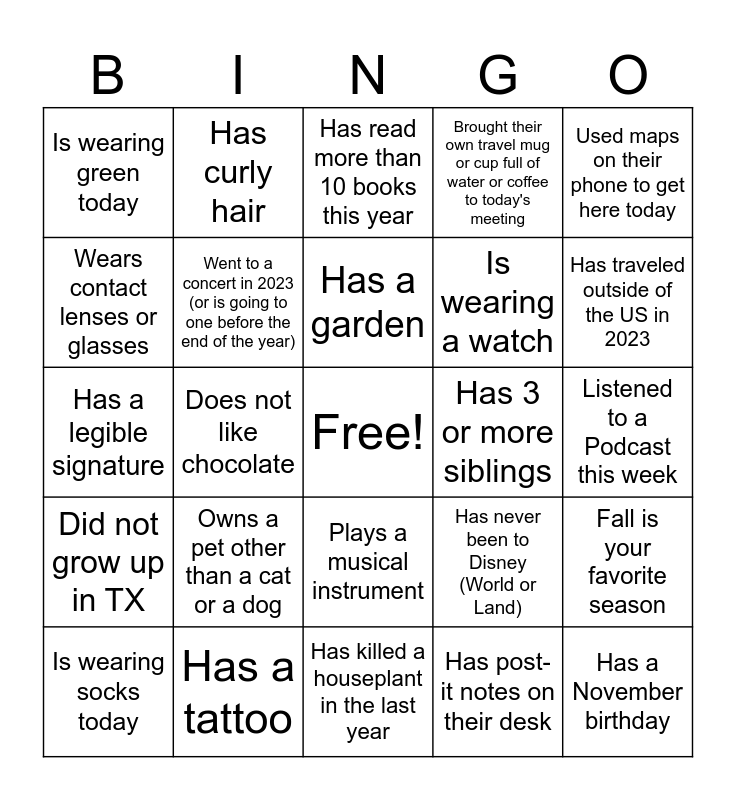 This bingo card has a free space and 39 words: Is not a Cowboys fan, Is left-handed, Has never broken a bone, Went to a concert in 2023 (or is going to one before the end of the year), Is wearing socks today, Plays a musical instrument, Has a garden, Is a night owl, Used maps on their phone to get here today, Did not grow up in TX, Does not like chocolate, Brought their own travel mug or cup full of water or coffee to today's meeting, Has a November birthday, Listened to a Podcast this week, Has 3 or more siblings, Owns a pet other than a cat or a dog, Does not drink coffee, Is wearing green today, Flosses their teeth at least once a day, Has never been to Disney (World or Land), Wears contact lenses or glasses, Has killed a houseplant in the last year, Is wearing a watch, Has traveled outside of the US in 2023, Born and raised in DFW, Has put up Christmas decor OR has listened to Christmas music already, Has a first name that is at least 8 letters long, Dressed up for Halloween, Has blue eyes, Has curly hair, Enjoys spicy food, Speaks more than one language, Has read more than 10 books this year, Has a tattoo, Has post-it notes on their desk, Has watched every episode of a TV series, Fall is your favorite season, Has a legible signature and Likes beans in their chili.