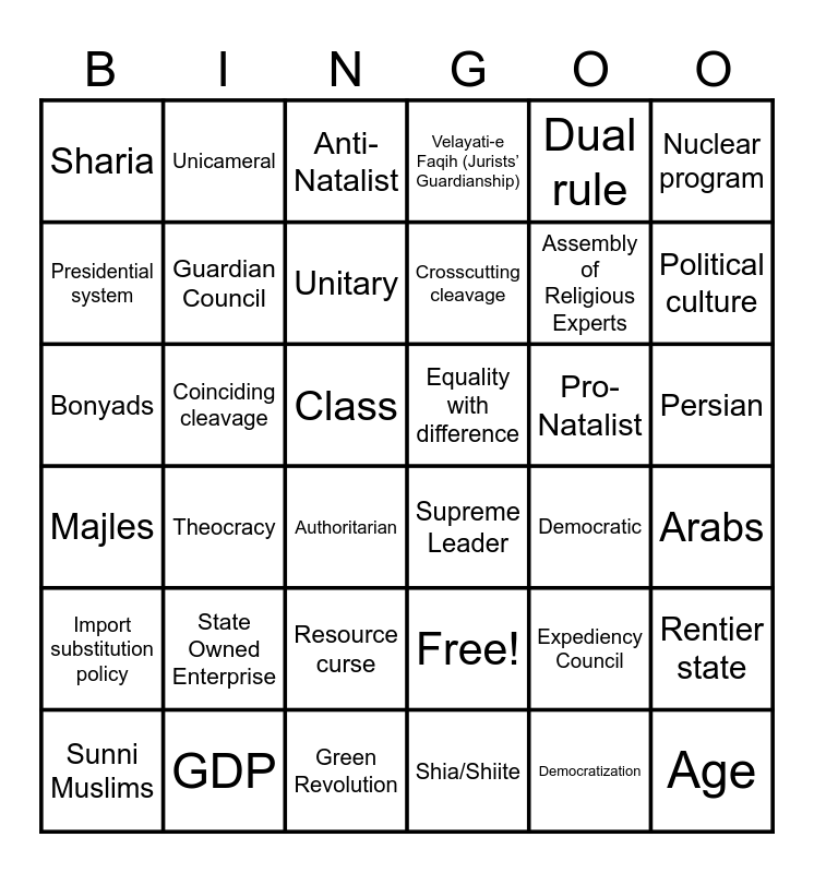 This bingo card has 36 words: Free!, Resource curse, Shia/Shiite, Presidential system, Majles, Equality with difference, Guardian Council, Green Revolution, Dual rule, Expediency Council, Political culture, Velayati-e Faqih (Jurists’ Guardianship), Rentier state, Coinciding cleavage, Crosscutting cleavage, Sharia, Import substitution policy, Pro-Natalist, Bonyads, Anti-Natalist, Class, Theocracy, Supreme Leader, Authoritarian, Democratic, Unicameral, Assembly of Religious Experts, GDP, Unitary, Nuclear program, Age, Sunni Muslims, Arabs, Persian, State Owned Enterprise and Democratization.