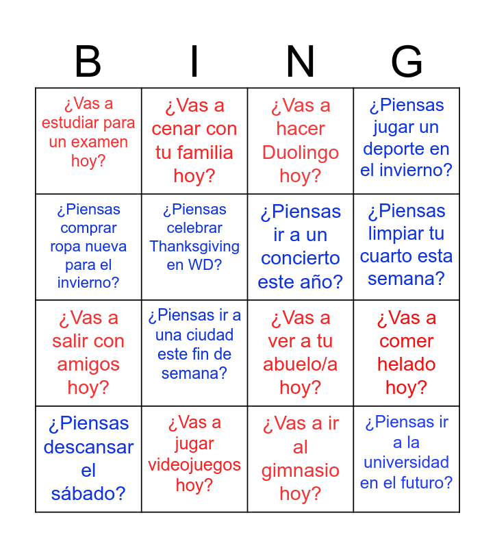 This bingo card has 16 words: ¿Vas a jugar videojuegos hoy?, ¿Vas a comer helado hoy?, ¿Vas a hacer Duolingo hoy?, ¿Vas a estudiar para un examen hoy?, ¿Vas a salir con amigos hoy?, ¿Vas a cenar con tu familia hoy?, ¿Vas a ver a tu abuelo/a hoy?, ¿Vas a ir al gimnasio hoy?, ¿Piensas comprar ropa nueva para el invierno?, ¿Piensas celebrar Thanksgiving en WD?, ¿Piensas descansar el sábado?, ¿Piensas jugar un deporte en el invierno?, ¿Piensas ir a una ciudad este fin de semana?, ¿Piensas limpiar tu cuarto esta semana?, ¿Piensas ir a un concierto este año? and ¿Piensas ir a la universidad en el futuro?.