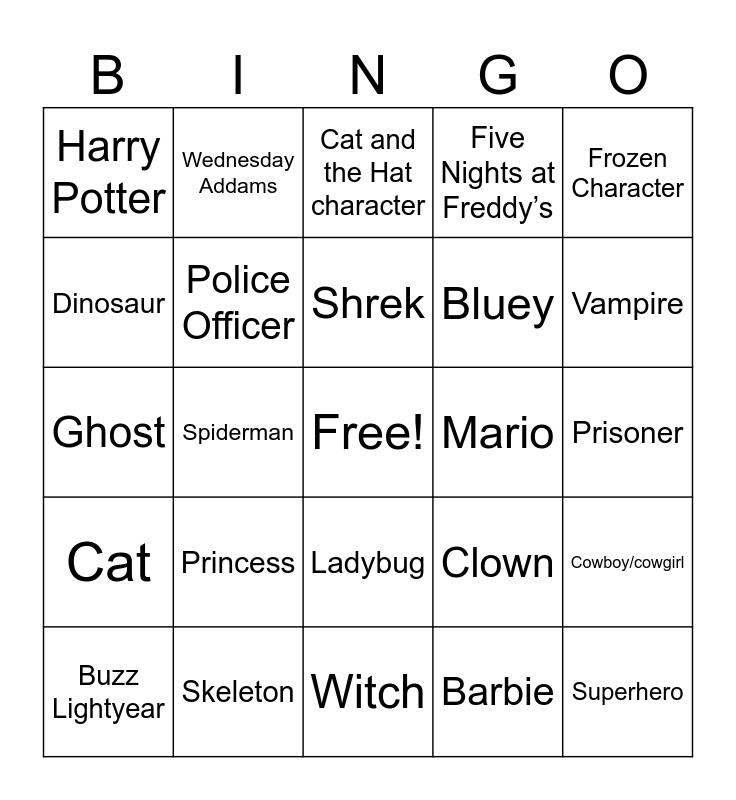 This bingo card has a free space and 24 words: Princess, Skeleton, Shrek, Buzz Lightyear, Frozen Character, Harry Potter, Dinosaur, Wednesday Addams, Mario, Ladybug, Bluey, Ghost, Clown, Cowboy/cowgirl, Police Officer, Barbie, Prisoner, Cat and the Hat character, Vampire, Spiderman, Superhero, Cat, Five Nights at Freddy’s and Witch.