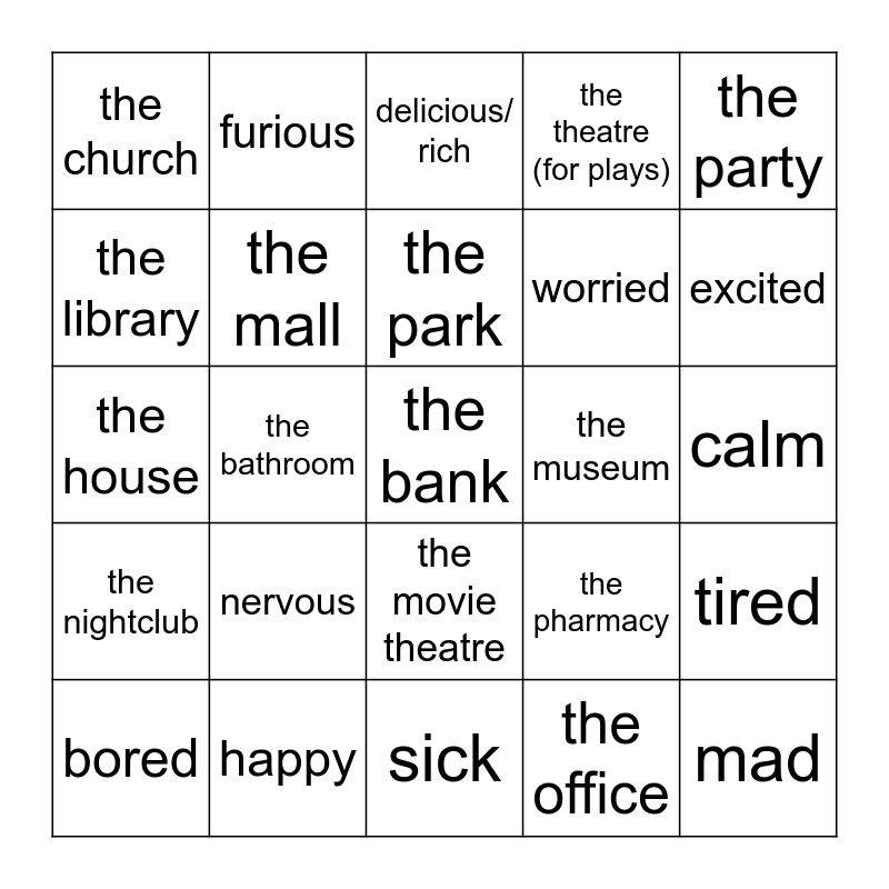 This bingo card has 35 words: the beach, the lake, the pool, the mall, the movie theatre, the theatre (for plays), the library, the store, the park, the gym, the house, the party, the school, the dept. store, the church, the museum, the office, the bathroom, the nightclub, the bank, the pharmacy, bored, tired, happy, delicious/ rich, excited, mad, busy, worried, calm, sad, sick, nervous, furious and the classroom.