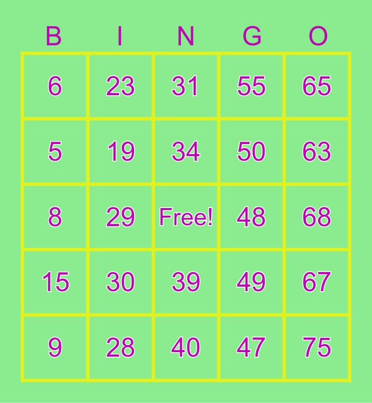 This bingo card has a free space and 75 words: 1, 16, 31, 46, 61, 2, 17, 32, 47, 62, 3, 18, 48, 63, 4, 19, 33, 49, 64, 5, 20, 34, 50, 65, 6, 21, 35, 51, 66, 7, 22, 36, 52, 67, 8, 23, 37, 53, 68, 9, 24, 38, 54, 69, 10, 25, 39, 55, 70, 11, 26, 40, 56, 71, 12, 27, 41, 57, 72, 13, 28, 42, 58, 73, 14, 29, 43, 59, 74, 15, 30, 44, 60, 75 and 45.