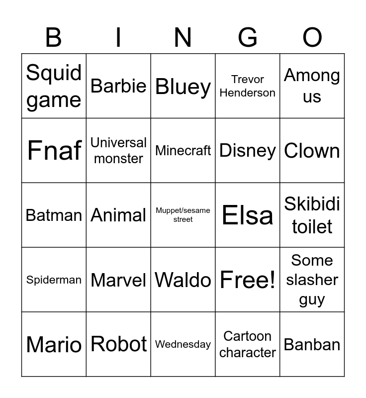 This bingo card has 25 words: Marvel, Wednesday, Minecraft, Mario, Among us, Squid game, Fnaf, Barbie, Elsa, Waldo, Disney, Batman, Free!, Some slasher guy, Universal monster, Banban, Skibidi toilet, Bluey, Clown, Animal, Muppet/sesame street, Robot, Spiderman, Trevor Henderson and Cartoon character.