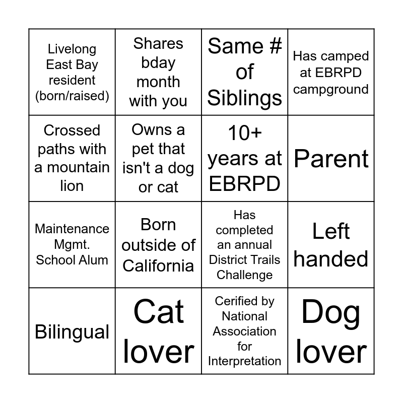 This bingo card has 16 words: Cat lover, Left handed, Same # of Siblings, Livelong East Bay resident (born/raised), Maintenance Mgmt. School Alum, Shares bday month with you, Has completed an annual District Trails Challenge, Cerified by National Association for Interpretation, Crossed paths with a mountain lion, Owns a pet that isn't a dog or cat, Bilingual, Has camped at EBRPD campground, Born outside of California, Parent, 10+ years at EBRPD and Dog lover.