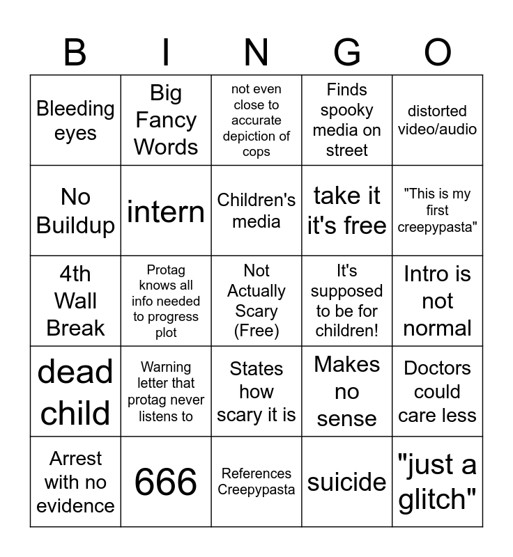 This bingo card has a free space and 59 words: Blood, 666, unnecessary gore, dead child, suicide, abuse, intern, satanism, take it it's free, mailman delivers Videogame, Finds spooky media on street, No common sense, No Buildup, NOT FAKE, CAPS, Bleeding eyes, "just a glitch", distorted video/audio, No reason for action, Children's media, It's supposed to be for children!, not even close to accurate depiction of cops, Arrest with no evidence, Doctors could care less, Protag was bullied, excessive detail, unsatisfying ending, sequelbait, "This is my first creepypasta", Poor grammar, Poor Formatting, Punctuation errors, Spelling errors, Repetitive vocabulary, Big Fancy Words, Destroys evidence, Foreign Language, Protag knows all info needed to progress plot, Spooky Title Cards, 4th Wall Break, Friend/Family Dies, Warning letter that protag never listens to, Intro is not normal, Nostalgia, Hyper-Realistic, Eyes are Black Sockets, Poorly Written, Occurs at Night, States how scary it is, References Creepypasta, Tells Reader that Story is Fake, Homophone error (ex: wrong your), "You're next", Inappropriate Laughter, Unnecessary details, Makes no sense, Tell don't Show, Guns/Knives and Protag introduces self.