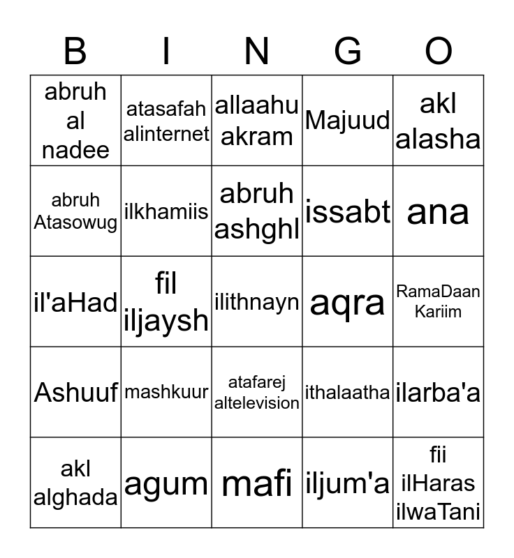 This bingo card has a free space and 24 words: mashkuur, agum, abruh ashghl, akl alghada, akl alasha, abruh al nadee, abruh Atasowug, atasafah alinternet, aqra, atafarej altelevision, issabt, il'aHad, ithalaatha, ilarba'a, ilkhamiis, iljum'a, RamaDaan Kariim, allaahu akram, ana, fil iljaysh, fii ilHaras ilwaTani, Ashuuf, Majuud and mafi.