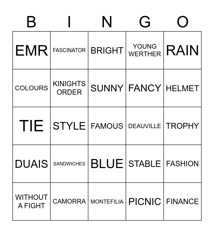 This bingo card has 42 words: HAIRSTYLE, SUNNY, FRIENDS, SANDWICHES, PICNIC, FASHION, FAMOUS, PRIZE, BRIGHT, BLUE, TROPHY, HELMET, STYLE, RAIN, MONEY., STABLE, BEER, TIE, CHAMPAGNE, FASCINATOR, COLOURS, BRAYBROOK, FINANCE, EMR, 2023, SADDLE, FANCY, WESTERN, HEALTH, PHARLAP, GOLD TRIP, DUAIS, KINIGHTS ORDER, MONTEFILIA, NUMERIAN, WITHOUT A FIGHT, CAMORRA, DEAUVILLE, STOCKMAN, VOW AND DECLARE, YOUNG WERTHER and HOO YA MAL.