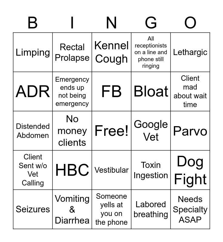 This bingo card has a free space and 24 words: HBC, Vomiting & Diarrhea, FB, Seizures, Lethargic, Limping, ADR, Rectal Prolapse, Google Vet, Vestibular, Bloat, Distended Abdomen, Toxin Ingestion, Dog Fight, Emergency ends up not being emergency, Labored breathing, Parvo, Kennel Cough, Client mad about wait time, No money clients, Needs Specialty ASAP, Client Sent w/o Vet Calling, All receptionists on a line and phone still ringing and Someone yells at you on the phone.