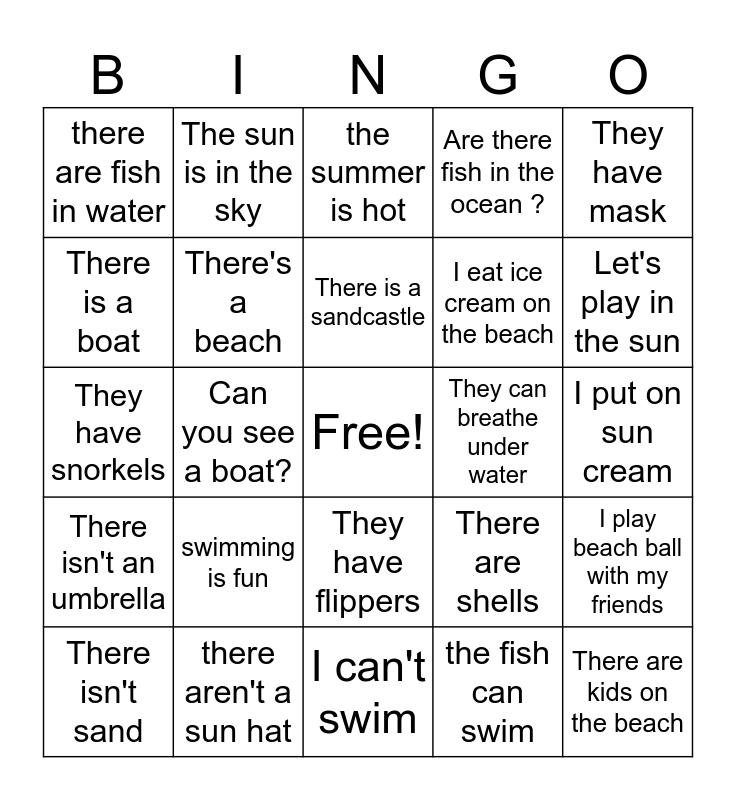 This bingo card has a free space and 24 words: swimming is fun, there aren't a sun hat, There is a sandcastle, There isn't sand, They have mask, there are fish in water, There is a boat, The sun is in the sky, They can breathe under water, They have flippers, I eat ice cream on the beach, They have snorkels, There are shells, I play beach ball with my friends, There's a beach, the fish can swim, I put on sun cream, the summer is hot, Let's play in the sun, Can you see a boat?, There are kids on the beach, There isn't an umbrella, Are there fish in the ocean ? and I can't swim.