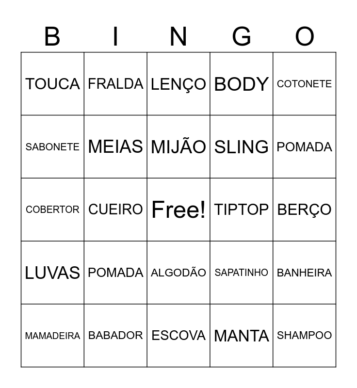 This bingo card has a free space and 24 words: POMADA, BABADOR, MIJÃO, MAMADEIRA, COTONETE, TOUCA, SABONETE, FRALDA, TIPTOP, ALGODÃO, SLING, COBERTOR, SAPATINHO, BANHEIRA, MEIAS, MANTA, BERÇO, LENÇO, POMADA, CUEIRO, SHAMPOO, LUVAS, BODY and ESCOVA.