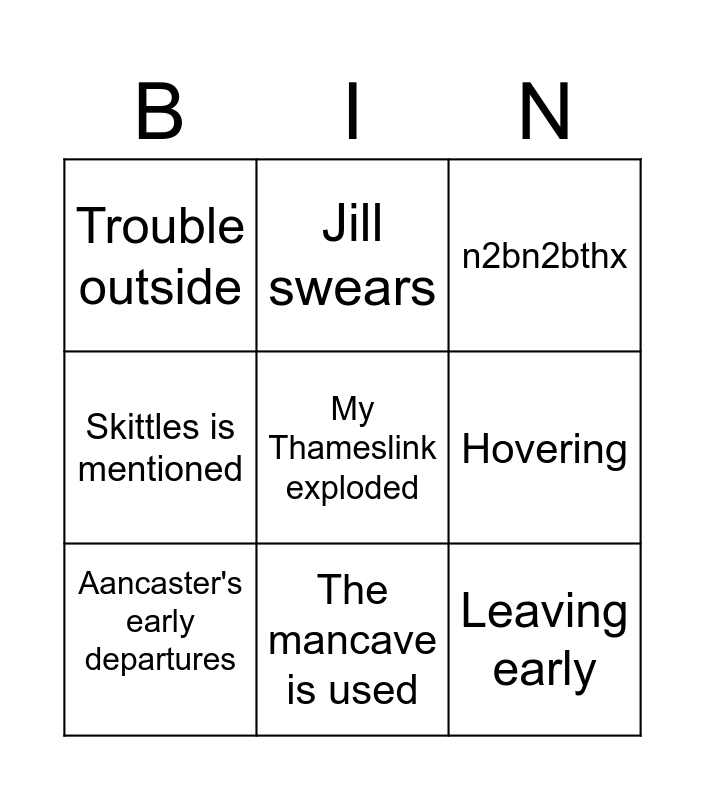 This bingo card has a free space and 8 words: Hovering, n2bn2bthx, Jill swears, Aancaster's early departures, Trouble outside, Leaving early, Skittles is mentioned and The mancave is used.