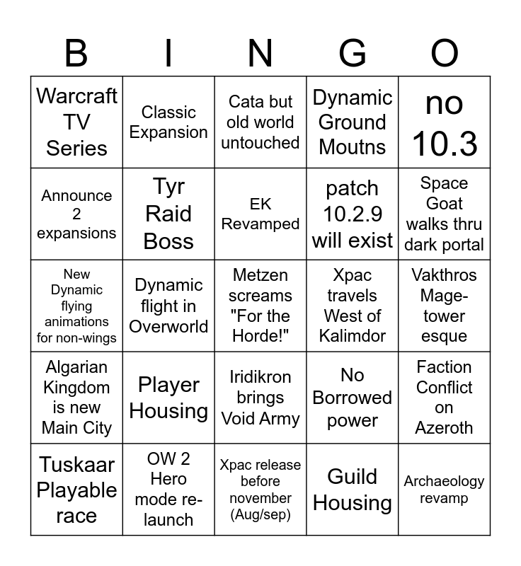 This bingo card has a free space and 24 words: Player Housing, OW 2 Hero mode re-launch, EK Revamped, Tuskaar Playable race, no 10.3, Warcraft TV Series, Announce 2 expansions, Classic Expansion, Xpac travels West of Kalimdor, Iridikron brings Void Army, patch 10.2.9 will exist, New Dynamic flying animations for non-wings, No Borrowed power, Faction Conflict on Azeroth, Tyr Raid Boss, Guild Housing, Vakthros Mage-tower esque, Cata but old world untouched, Space Goat walks thru dark portal, Dynamic flight in Overworld, Archaeology revamp, Algarian Kingdom is new Main City, Dynamic Ground Moutns and Xpac release before november (Aug/sep).